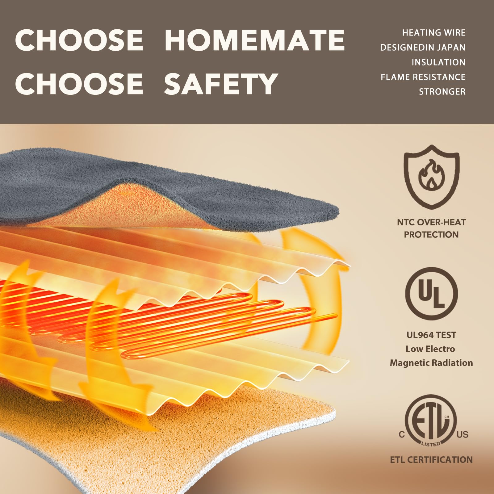 - ★SAFETY: Homemate Electric blankets have passed the American safety UL964 Test.Have ETL Certification.Lower Electro Magnetic Radiation.The heating wire is designed and produced by Japanese company,more advanced technology,stronger insulation and flame resistance.Moreover,the heated blanket use NTC overheating protection technology, 8 hours auto shut off to ensure that it will not overheat and cause burning.